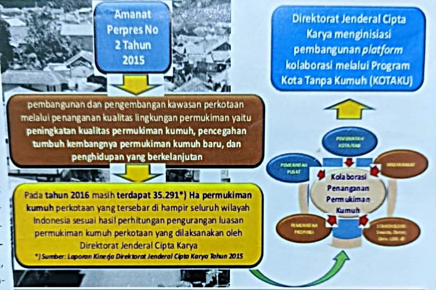 PRORGRAM KOTAKU (Kota Tanpa kumuh) Merupakan Program pada Direktorat Pengembangan Kawasan Perkumkiman, Ditjen Cipta Karya Kementrian Pekerjaan Umum dan Perumahan Rakyat (PUPR), dalam rangka Meningkatkan kapasitas masyarakat dan pemerintah daerah untuk penanganan permukiman kumuh di perkotaan. PROGRAM KOTAKU dalam pelaksanaanya, Menggunakan platform kolaborasi antara Pemerintah daerah, Pemerintah Provinsi, Pemerintah Pusat dan Pemangku kepentingan lainya, serta menempatkan pemerintah kabupaten/Kota sebagai Pelaku utama/Motor Penggerak (Nahkoda)